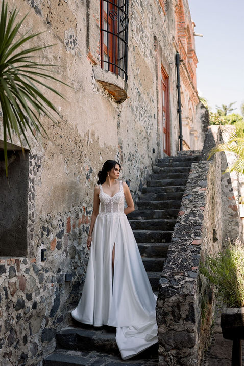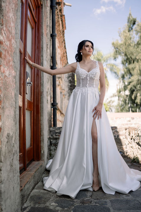 Este diseño corte “A” confeccionado en tull bordado con fina pedrería y flores 3D crea de un top semitransparente con una maravillosa falda lisa y abertura en uno de los laterales de la parte delantera.